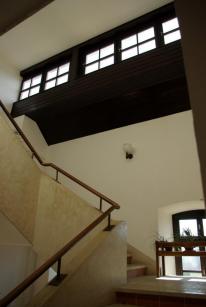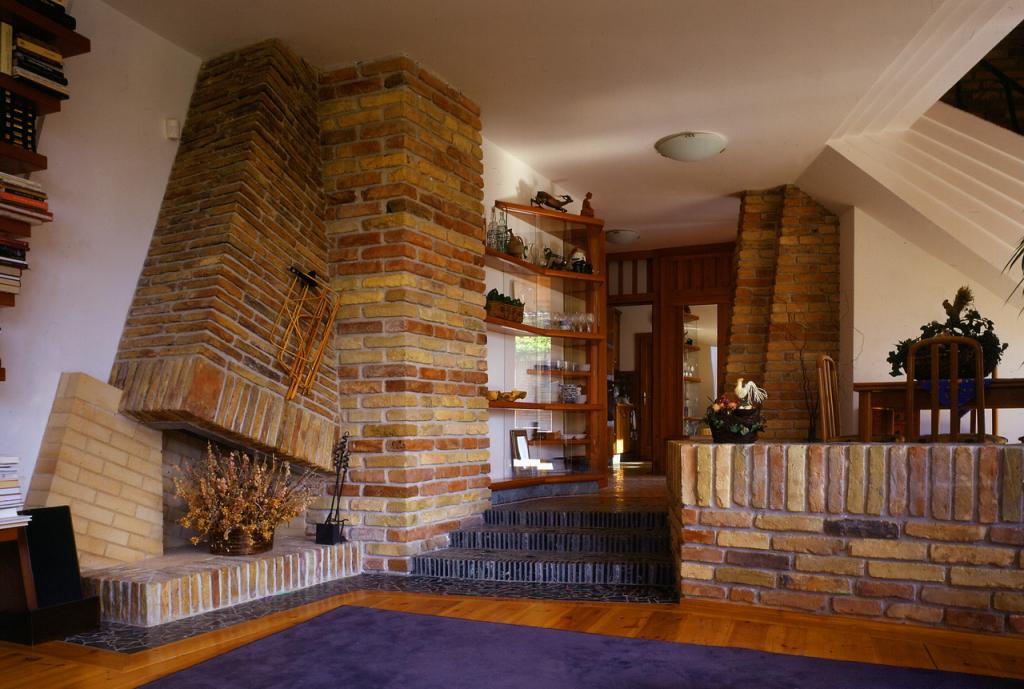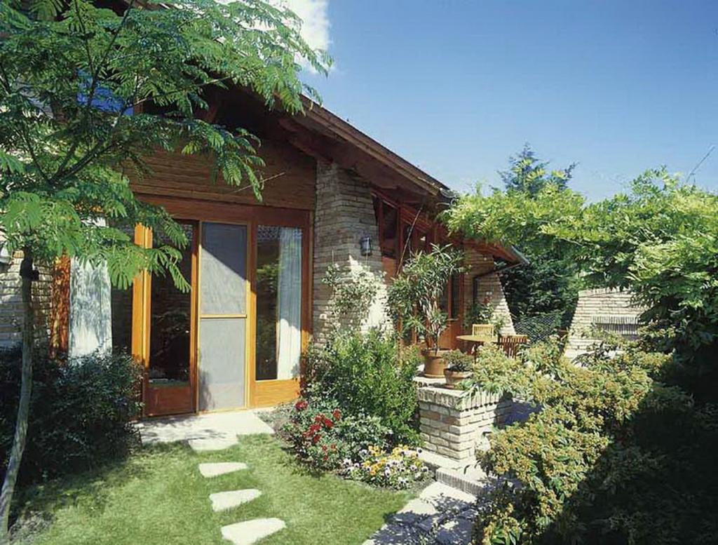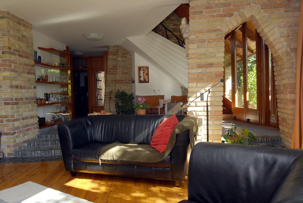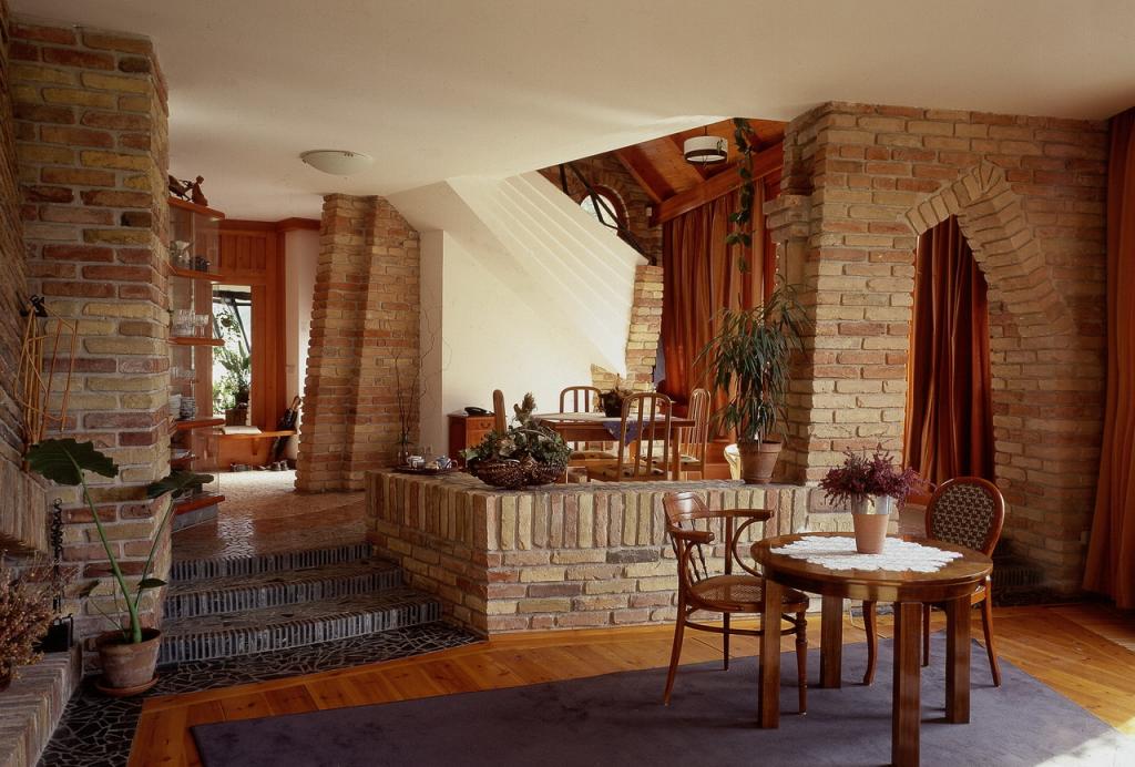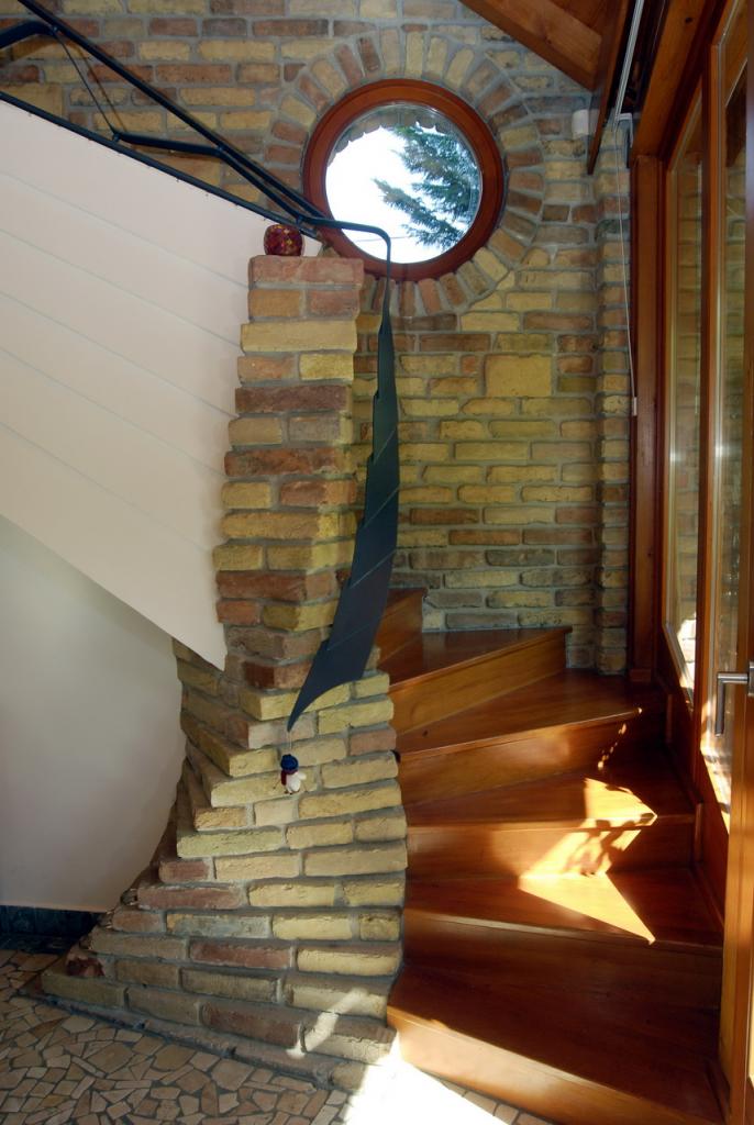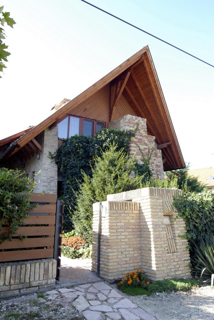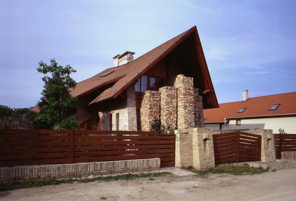 A ház 2 db közel 130 m2 hasznos alapterületű lakást tartalmaz, földszint + tetőtérbeépítéses elrendezésben. A kisméretű telek észak-déli tájolású, két utcára nyíló. Az épület hosszirányban kitölti a teljes beépíthető területet, így egymásnak hátatfordítva különülnek el a lakások. A bejárati homlokzat északi tájolása adja, hogy a rusztikus falazatú növénnyel befuttatott, és a parapetig földdel feltöltött téglapillérek az éléskamrát rejtik. Ezzel a zártsággal szemben a belső pilléresített, kinyúló tetős mennyezetig érő üvegfalakkal feltáruló udvari homlokzatok a kerttel való teljes összenyitást hangsúlyozzák. A szomszédok felé tömör, de tagolt lugas szerűen kiképzett kerítéssel zárunk, így átriumosítva a kertet. A ház és kerítés anyaga bontott tégla, pácolt fa, és égetett cserép, burkolata koptatott, tört márvány, valamint sok-sok növény.