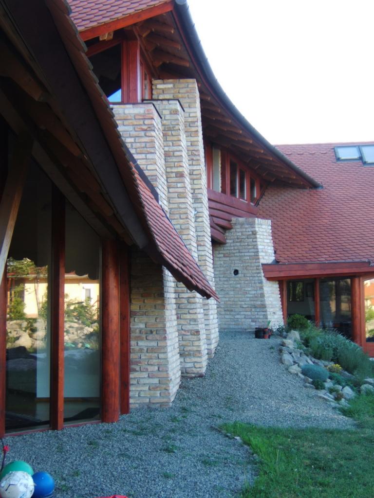 Két összevont telekre egy generációs házként működő kétlakásos házat kellett tervezni, földszint + tetőtérbeépítéses elrendezésben.A nagyobbik lakás 190 m2 , a kisebbik 115 m2 -es lett. A kétállásos gépkocsiszín az épület közepén helyezkedik el, szétválasztva a lakásokat. Az utca felé falakkal zárt épület az udvar felé pilléresített földig érő üvegfelületekkel tárul fel. Az épület anyaga hőszigetelő tégla, bontott tégla külső felületekkel, födéme monolit vasbeton szerkezetű, fa nyílászárók, és a tetőn hódfarkú cserépfedéssel.