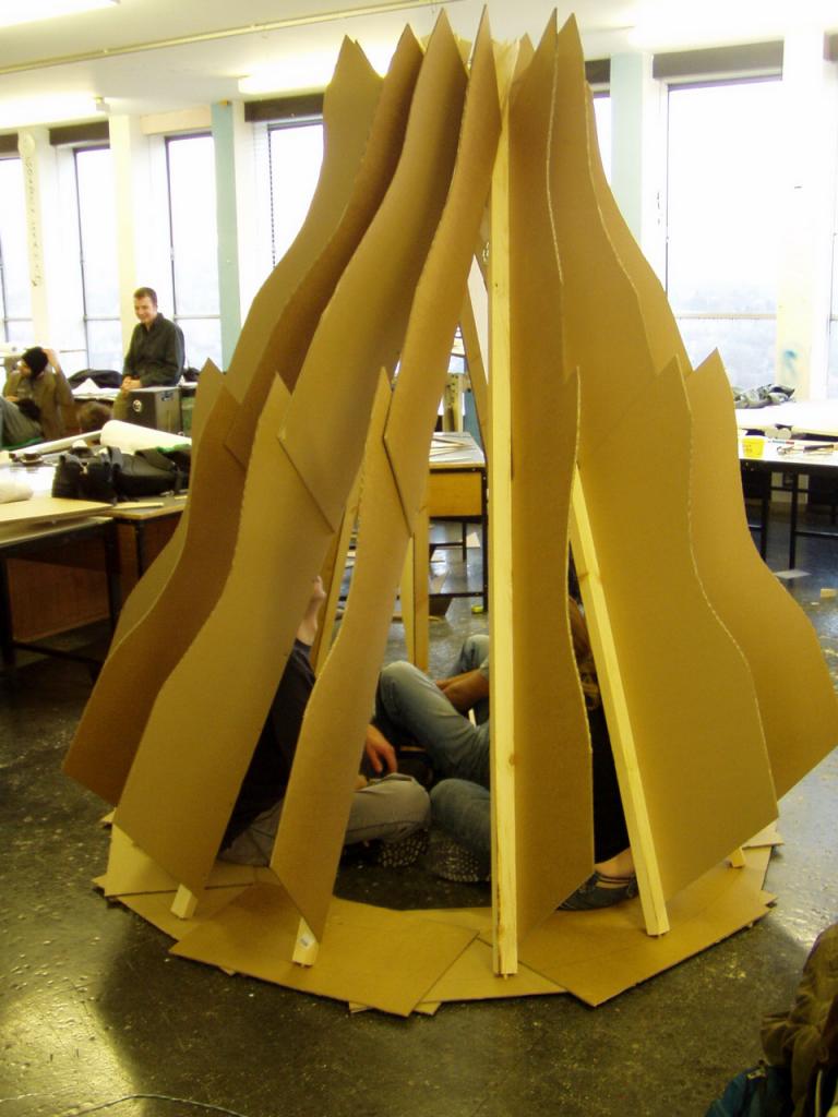 A rövid idő ellenére, (valójában a három etap háromszor két-három órát jelentett) jól sikerült a gyakorlat. Elsőre mindenki csak a fizikális létre gondolt és a fizikailag szükséges térben gondolkoztak. Azaz evés, alvás stb. A lelki ill. szellemi minimál térben senki nem gondolkodott. A közös megbeszéléseken a segítségünkkel léptek tovább ill. gondoltak arra, hogy az ember több annál, mint amit vázlataikban gondoltak róla. A délutáni foglalkozáson több jó megoldás is született. A végleges változatot másnap együtt építettük meg. Az összeállítás második nekifutásra sikerült. A kúp alakú tér felülete rostélyszerűen szétnyíló papírlamellákból állt. A teljesen zárt és a teljesen nyitott állapot között minden változat elképzelhető volt. A kúp alkotói 5/5 cm-es staffli fából készültek. Az alkotók forgatása tette lehetővé a rostélyok nyithatóságát.