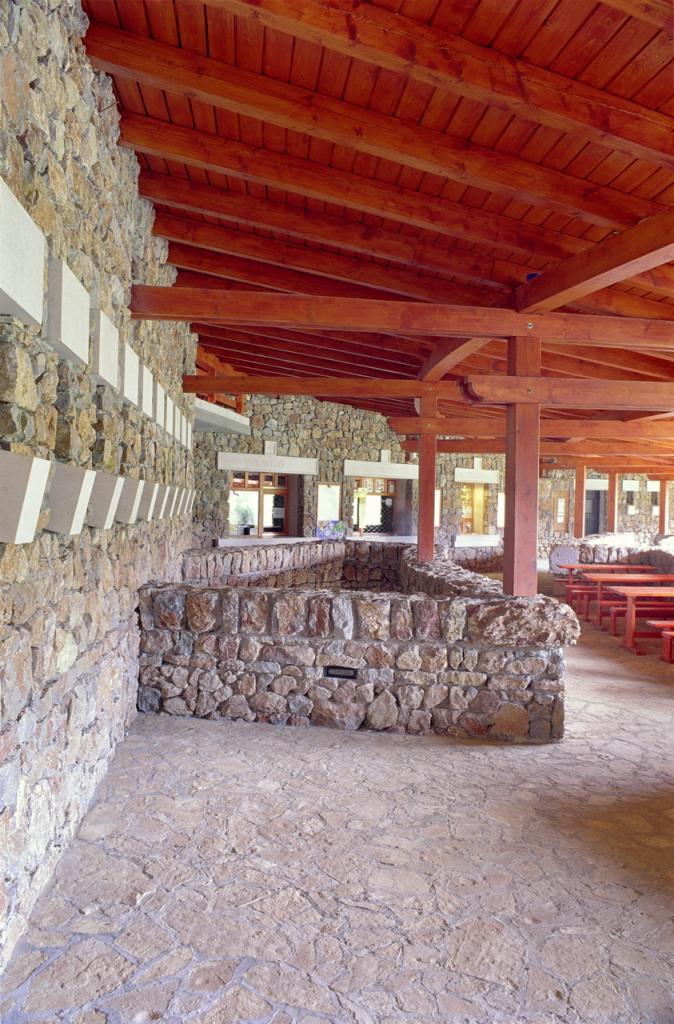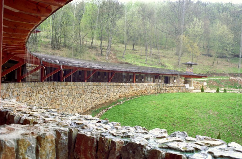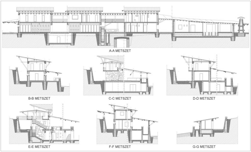 PARKOSÍTÁS: A táj karaktere, a védett Nemzeti Park és az épület elhelyezkedéséből következően kiemelt fontosságot és hangsúlyt kell fektetni a kertépítészeti kialakításra. A meglévő fák állapotfelérése után, a tervünkön látható módon telepítve, a töbör formáját kiemelve, a rétegvonalat követve bokrokat, fentebb a meglévőket kiegészítve, fákat kell telepíteni az itt őshonos fafajokból (tölgy, gyertyán, hárs, kőris). A középen kialakuló tisztásra ligetesen borókákat ültettünk. A mélyedés formáját kiemelve. A rétegvonalakat követve asztalokat, alacsony támfallal körülvett szalonnasütő helyeket lehet kialakítani.