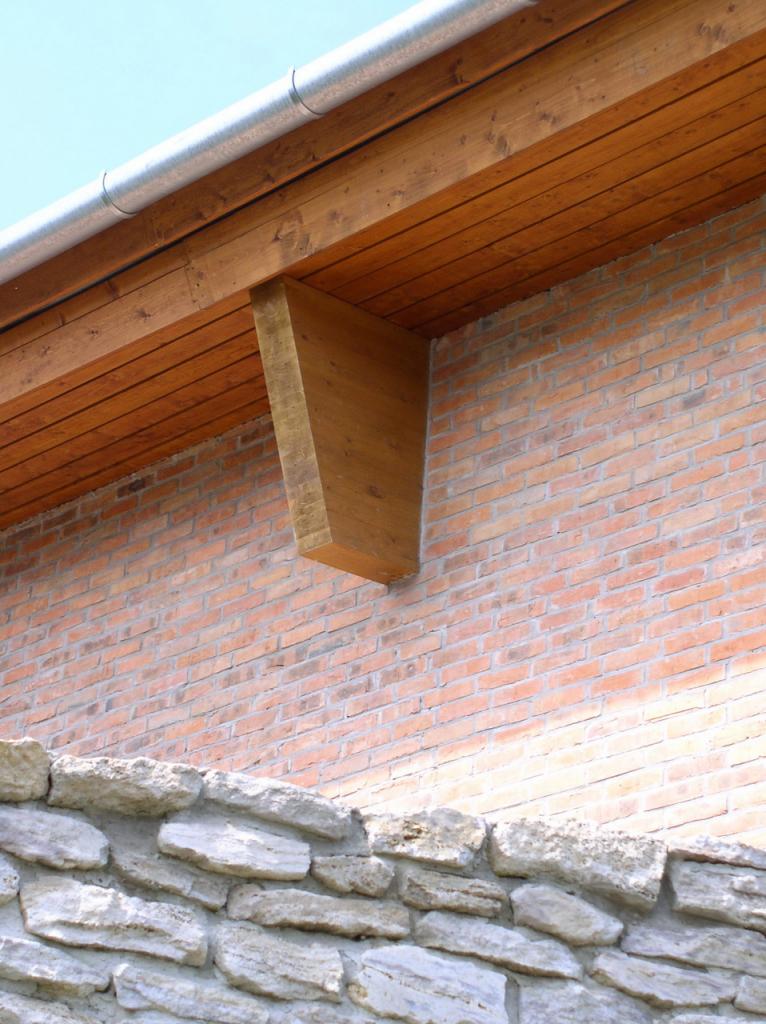 Az épület látszótégla burkolatú, kivéve az előbb említett oromfalat és kerítést, amelyek terméskőből készültek. A ház laposhajlású tetője fémlemez fedésű. A medenceterek fölötti tető egy egyszerű szerkesztésű ragasztott fa főtartókból álló szerkezet.
