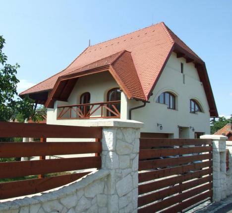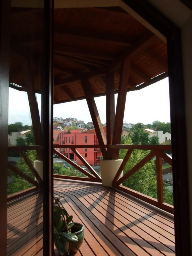 helyezete teszi sajátossá és a padlásteret megvilágitó nyújtott trapéz alakú ,vissaugró falrészbe helyezett ablak.A ház belső térelosztása a közlekedő vizszintes valamint a nappali központi oszlopának függőleges tengelyére szervezett ami meglehetősen tömör kifejezést kölcsönöz a háznak ezt hansúlyozzák a sudarasodó vistai kővel burkolt oszlopok is. A terasz körbefut több szinten a nappali illetve a társalgó tengelye körül , a kitáruló völgy, a látvány szerves részévé válik.A hatalmas kert nem kis erőfeszitéssel Dávid Zoltán kertész munkájával szelidült barátságos pihenő, játszó -térré.