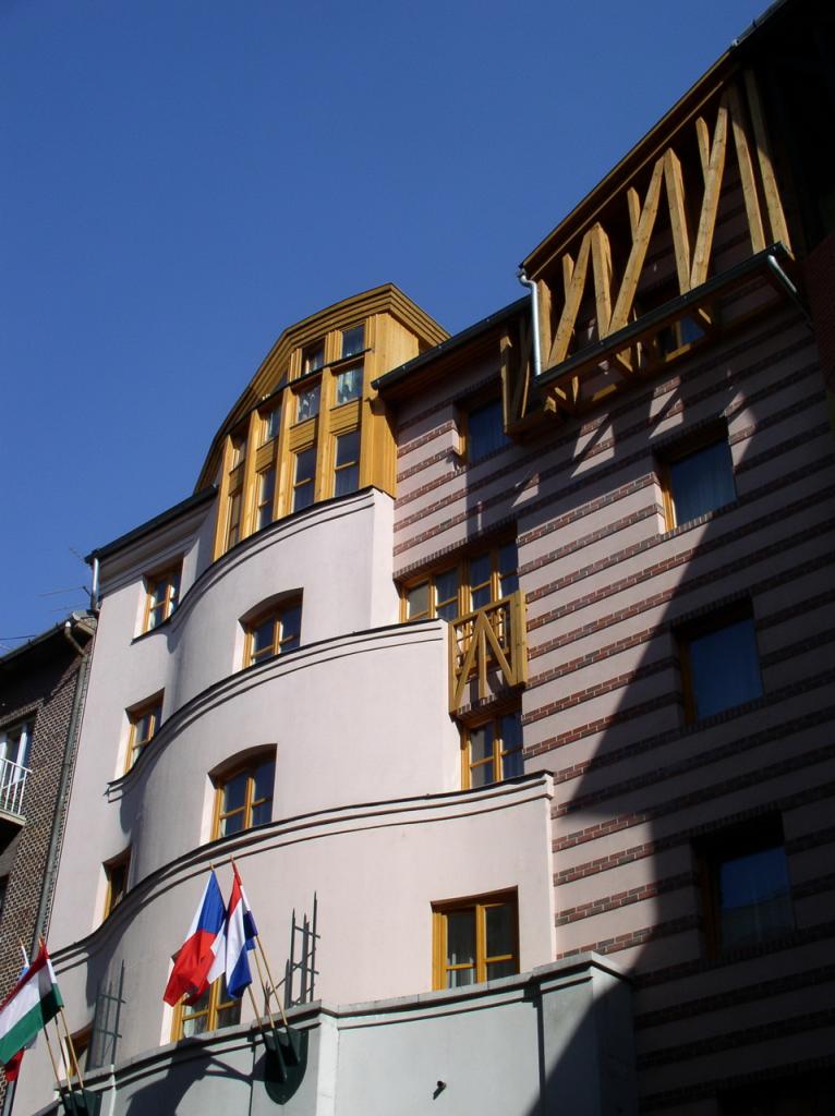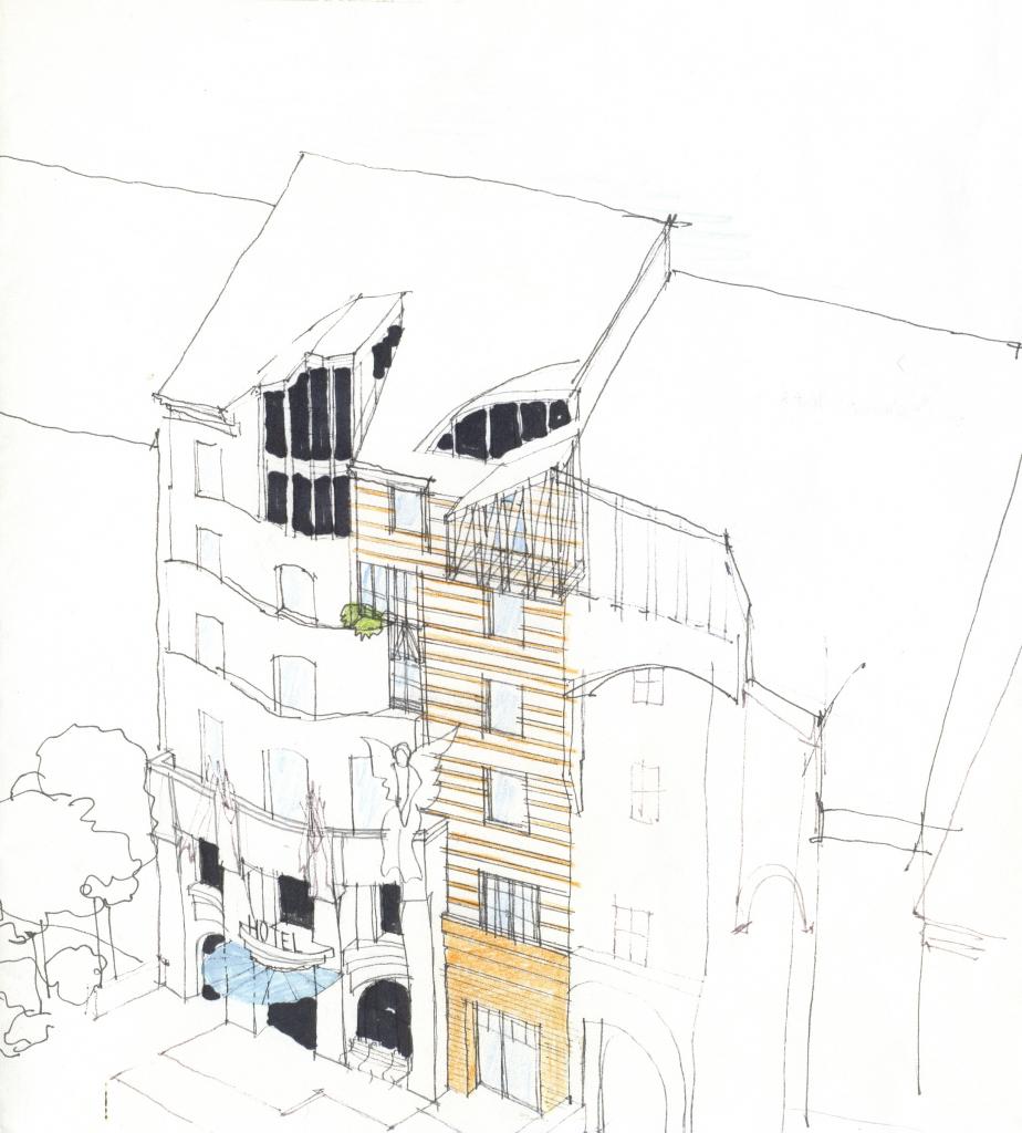 Az épület egyfajta válasz, kiegészítés a szomszédos ? Dévényi Sándor által tervezett szállodaépülethez.